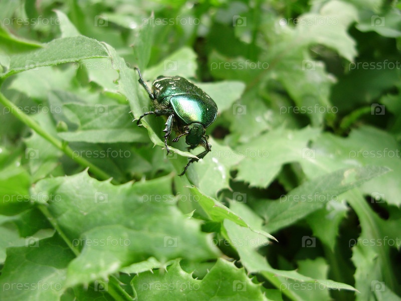 Зеленый блестящий жук сидит на траве