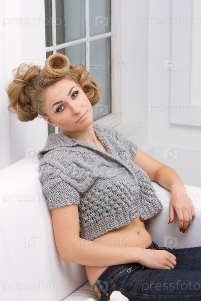 Красивая стройная белокурая девушка в сером жакете