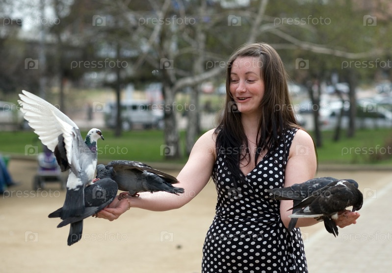 Женщина кормит голубей в парке