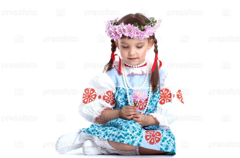 Счастливая маленькая девочка в славянском костюме и венке