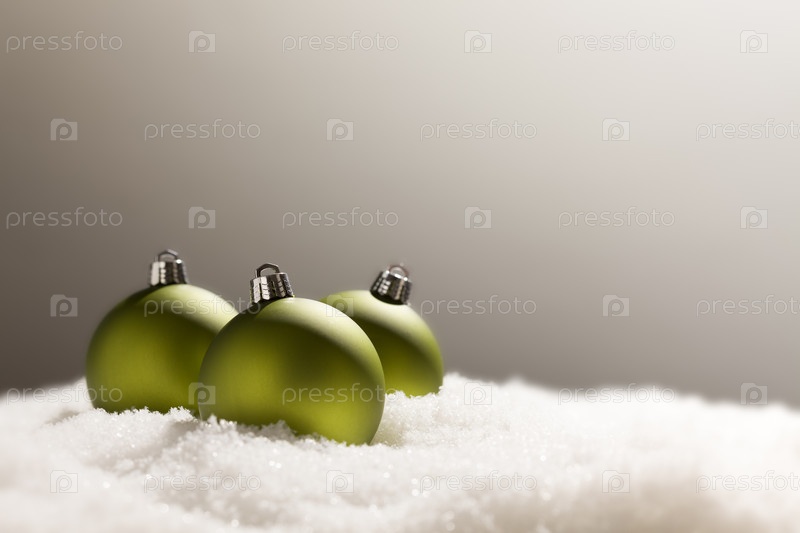 Зеленые рождественские украшения на снегу на абстрактном фоне