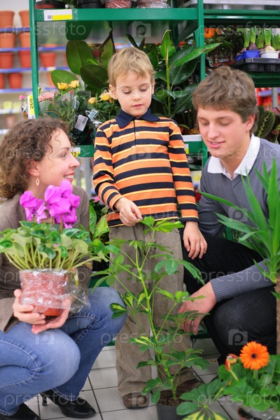 Молодая семья в цветочном магазине