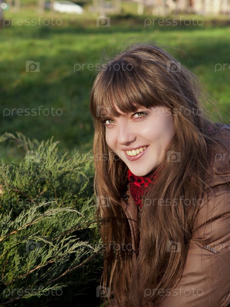 Красивая молодая девушка с темными волосами и в коричневом пальто