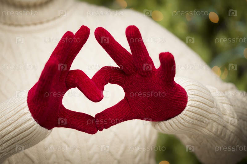 Женские руки в красных варежках показывают знак сердца