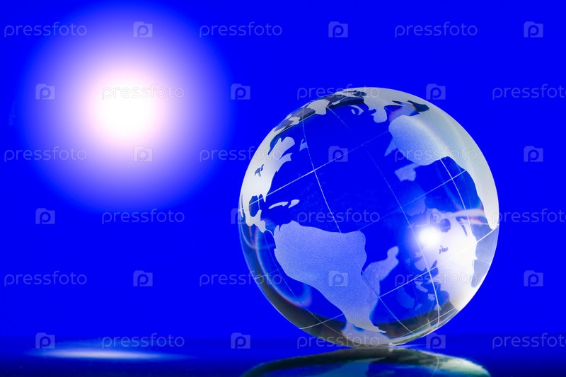 Стеклянный шар, яркое освещение, на голубом фоне