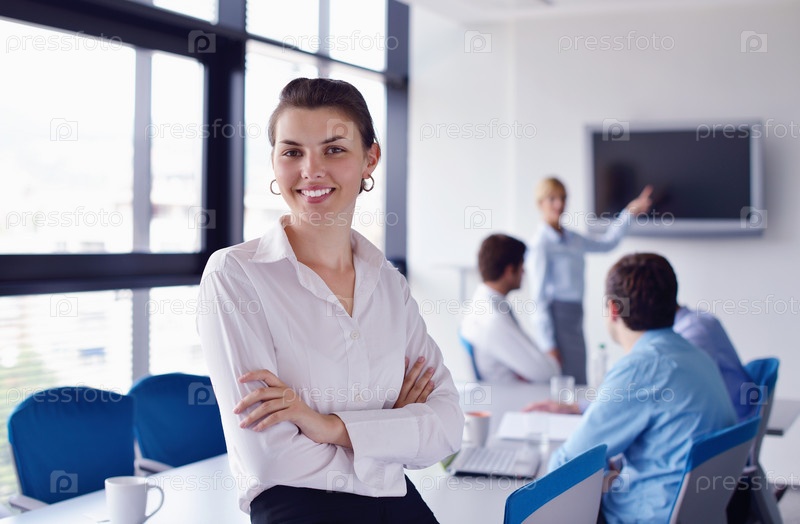Бизнес-леди с ее сотрудниками в офисе