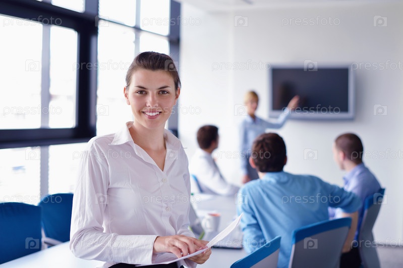 Бизнес-леди с ее сотрудниками в офисе