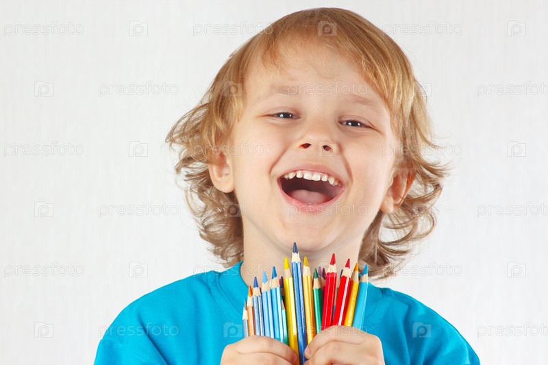 Маленький милый белокурый мальчик держит цветные карандаши на белом фоне
