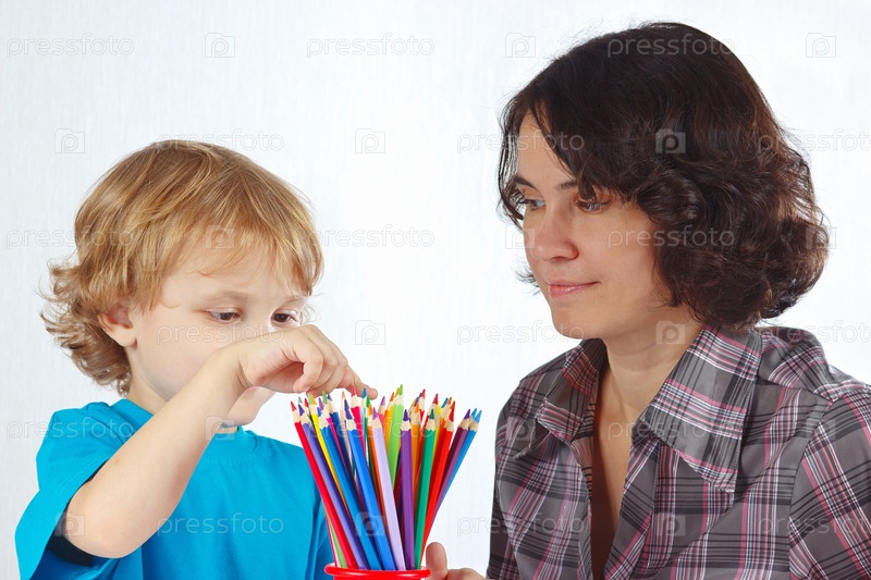 Улыбающийся мальчик с его матерью и цветными карандашами на белом фоне