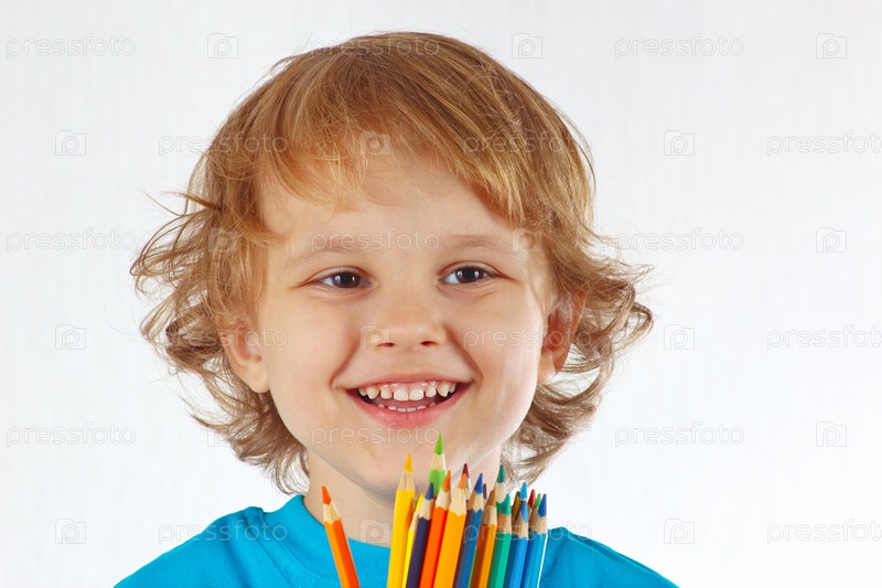 Улыбающийся мальчик с цветными карандаши на белом фоне