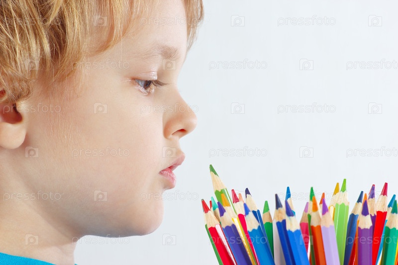Маленький милый белокурый мальчик с цветными карандашами на белом фоне
