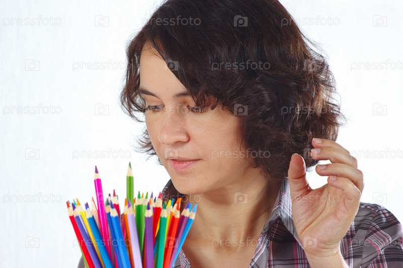 Молодая женщина с цветными карандашами на белом фоне