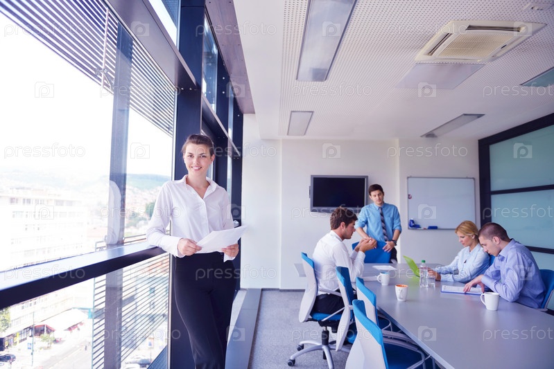 Бизнес-леди с ее сотрудниками в офисе