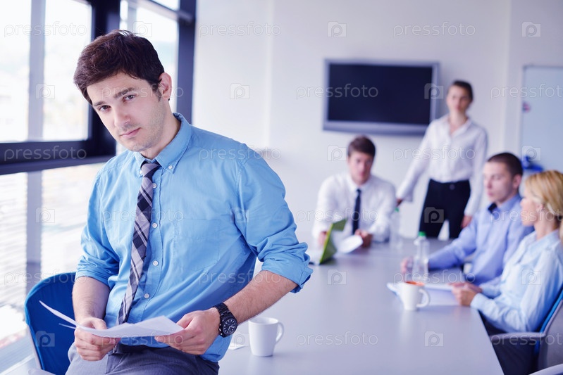 Деловой человек на встрече с коллегами на заднем плане