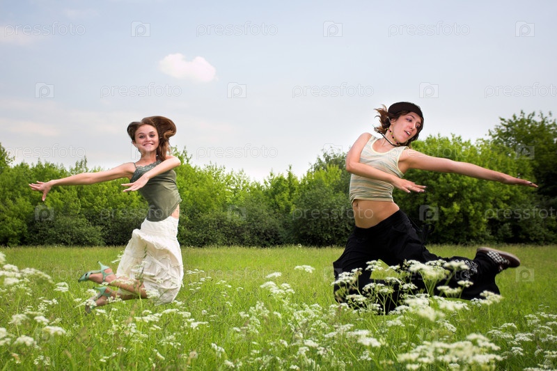 Две девушки в прыжке на зеленом лугу