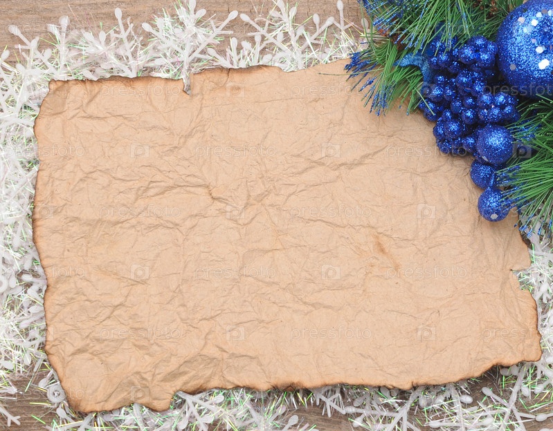 Рождественский фон. Пустой старый лист бумаги и рождественские украшения