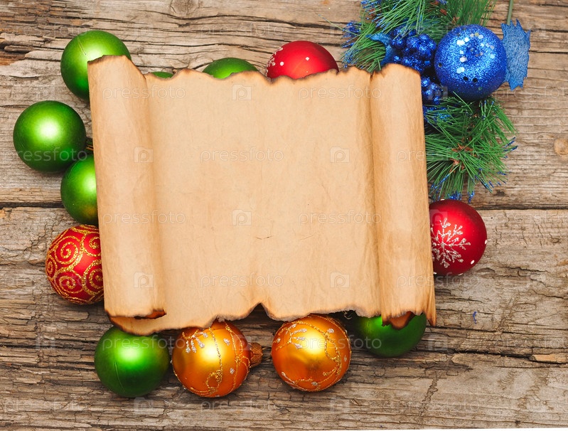 Рождественский фон. Пустой старый лист бумаги и рождественские украшения