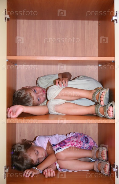 Двое детей спят на полке в шкафу
