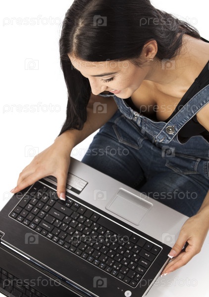 Молодая красивая женщина работает на ноутбуке, вид сверху