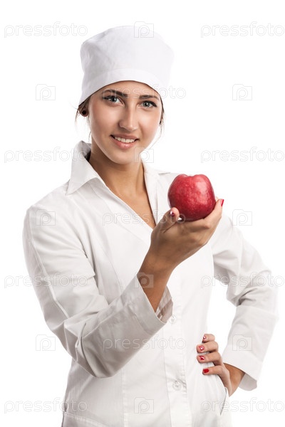 Улыбающаяся молодая женщина-врач с яблоком на белом фоне