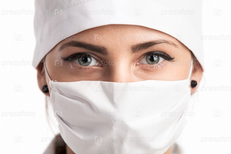 Молодая женщина-врач в маске и колпаке крупным планом
