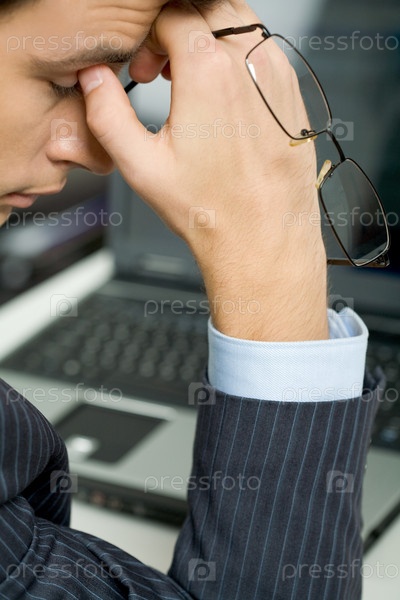 Фото уставшего мужчины со снятыми очками, держащего руку рядом с лицом после тяжелого рабочего дня