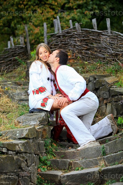 Молодая романтическая пара в украинских национальных костюмах на открытом воздухе