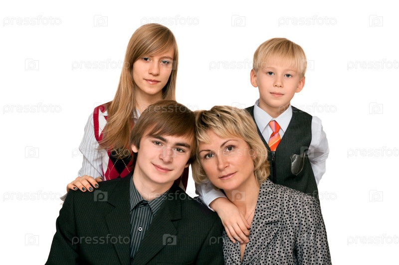 Мать и трое детей на белом фоне