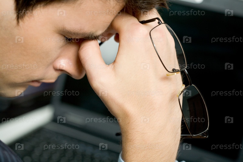 Фото уставшего мужчины со снятыми очками, держащего руку рядом с лицом после тяжелого рабочего дня