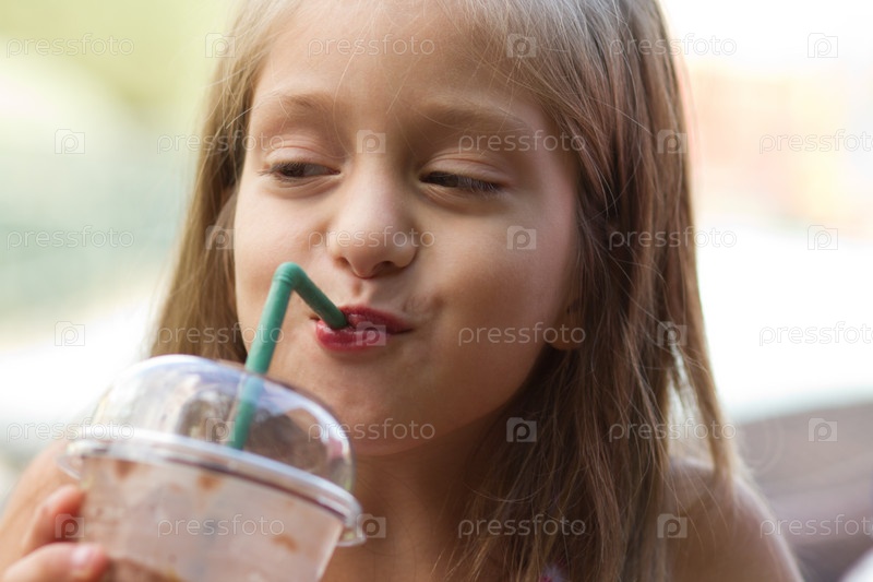 Смешная девочка пьет молочный коктейль