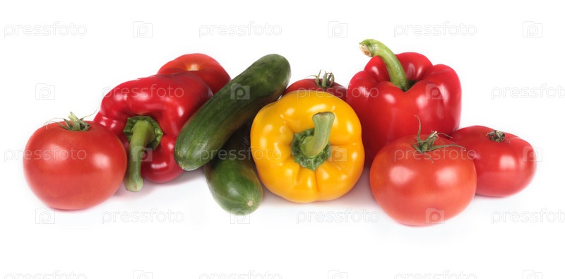 Перцы, помидоры и огурцы на белом фоне