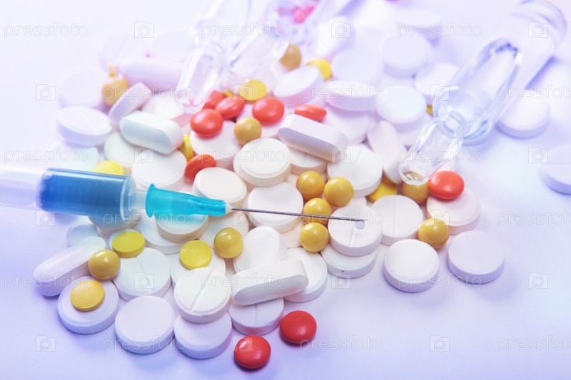 Шприц на фоне таблеток и пилюль