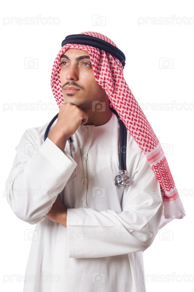 Арабский врач со стетоскопом на белом фоне