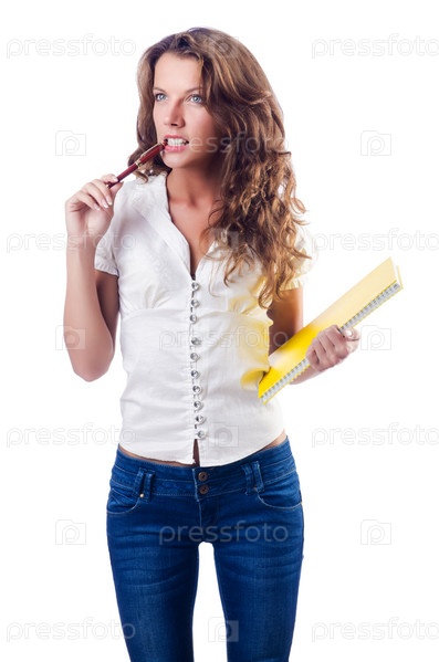 Молодая студентка на белом фоне