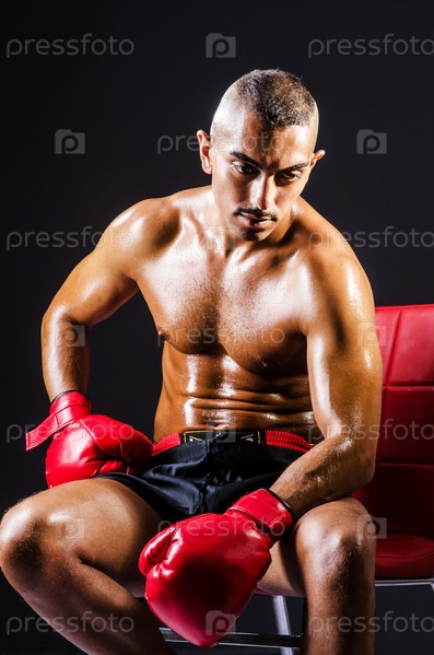 Боксер с красными перчатками в темной комнате