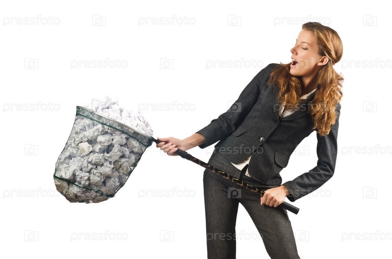 Женщина с полным сачком бумаги на белом фоне