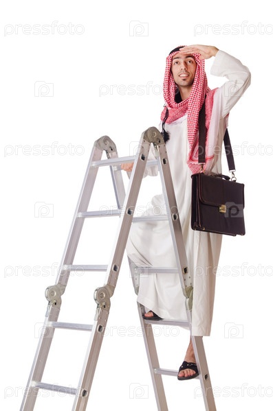 Арабский бизнесмен поднимается по карьерной лестнице на белом
