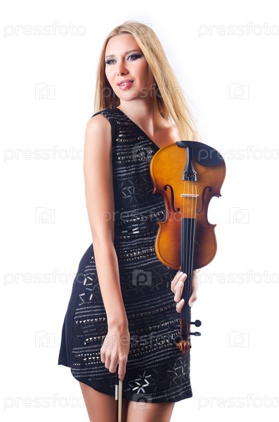 Молодая женщина со скрипкой на белом фоне