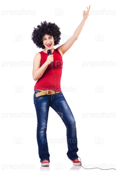 Женщина с африканской прической и микрофоном в руке на белом фоне