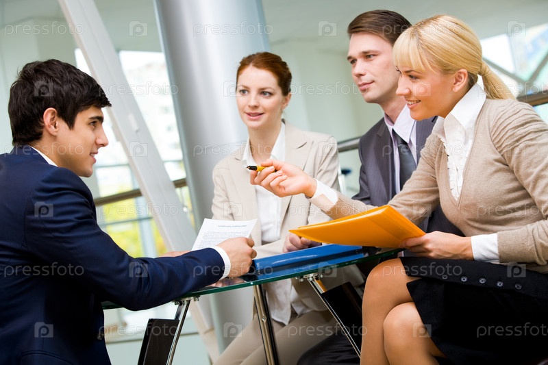 Дружеская группа специалистов, разговаривающих с бизнесменом во время переговоров