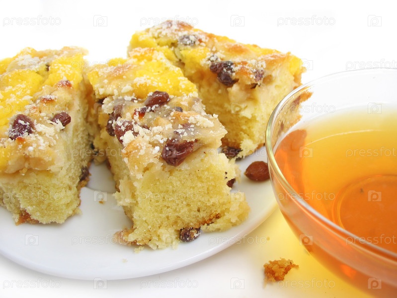 Кусок пирога с кружкой чая на белом фоне