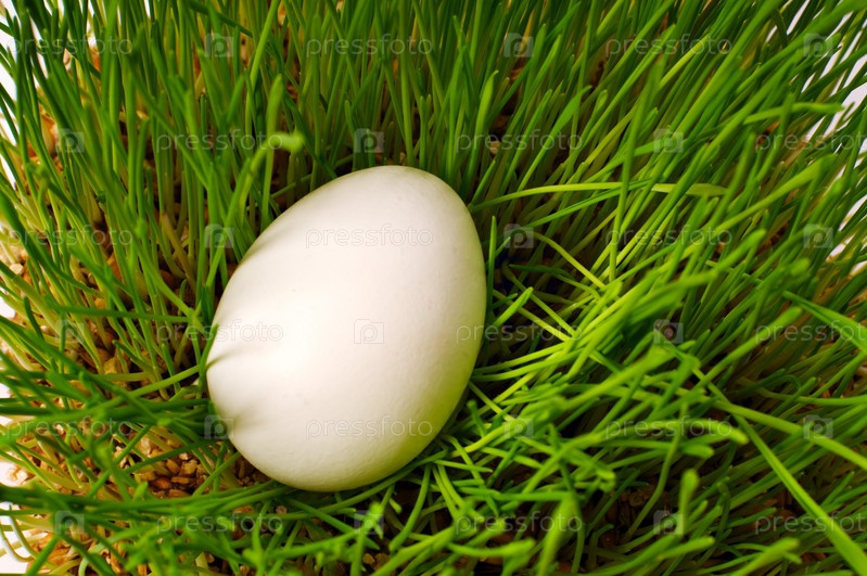 Одно белое яйцо на зеленой траве