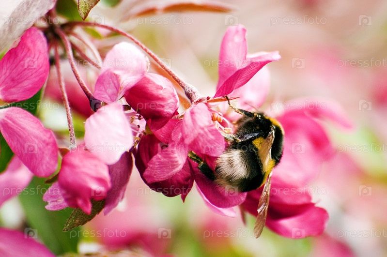 Розовые яблоневые цветы и шмель