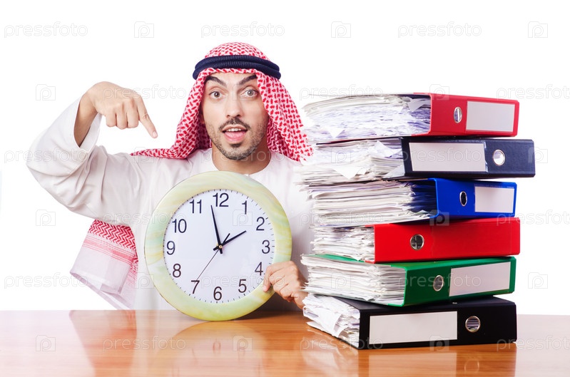 Молодой араб с папками бумаг и часами за рабочим столом