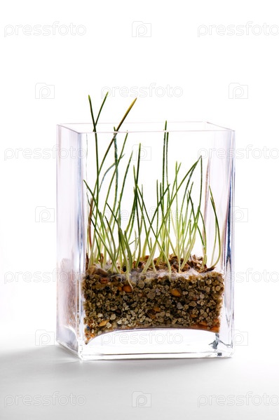 Зеленая трава с землей в стеклянной вазе на белом фоне