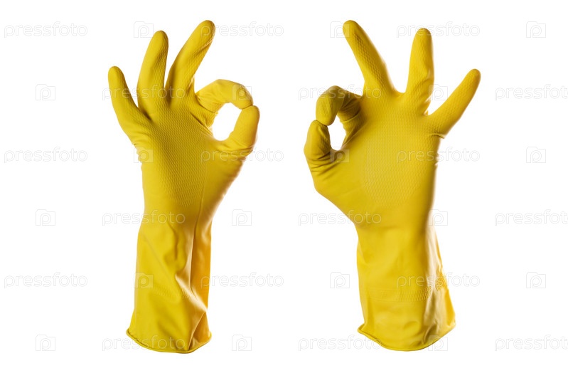 Резиновые перчатки показывают жест ОК на белом фоне