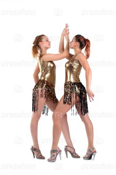 Сексуальные женщины позируют в золотых костюмах го-го, изолированные