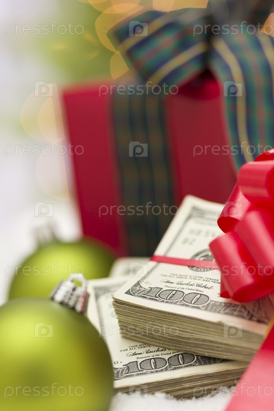 Стопка стодолларовых купюр с бантом рядом с рождественскими украшениями