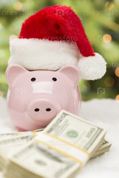 Розовая копилка в шапке Санта-Клауса возле стопки денег на снегу