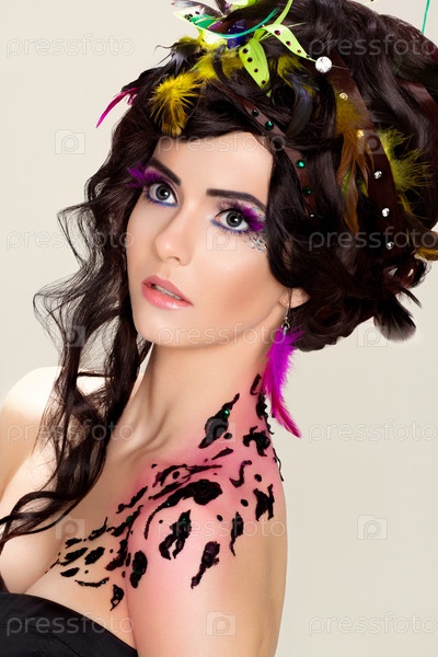 Футуристическая роскошная прическа. Яркий макияж и татуировки